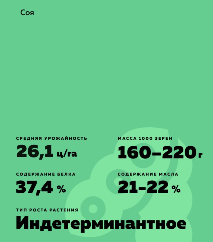 Glycine max (L.) Merr.). Среднеранний сорт сои для возделывания на зерно в основных посевах. Высокотехнологичный сорт, прост в производстве.