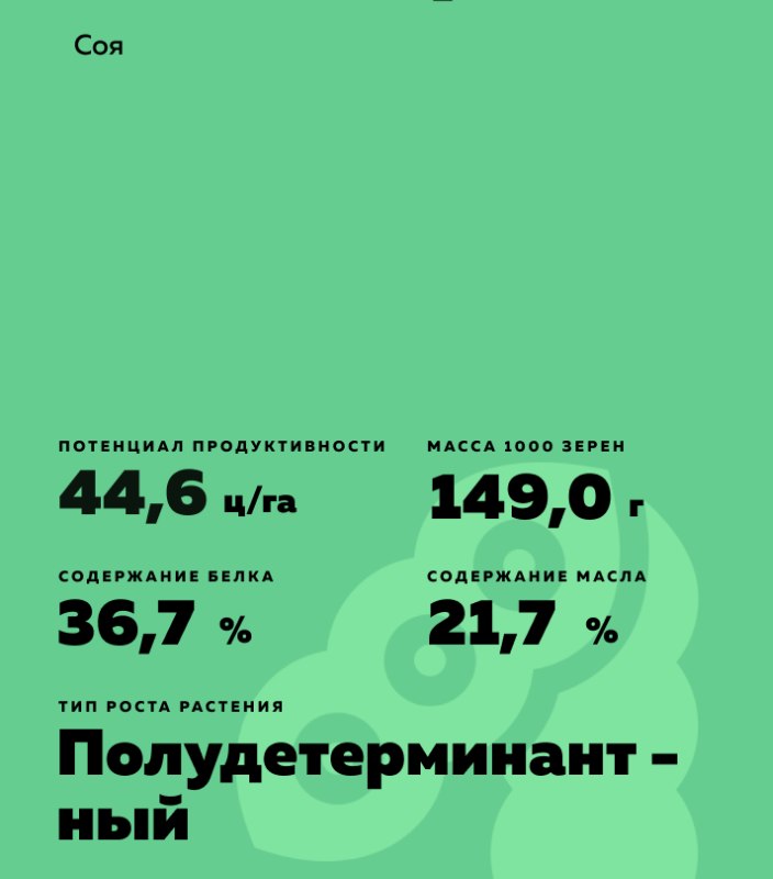 - Средняя урожайность семян в Северо-Кавказском (6) регионе - 16,2 ц/га. Максимальная урожайность семян - 31,6 ц/га на Лабинском ГСУ Краснодарского края в 2018 году. Вегетационный период - 111 дней. Масса 1000 семян - 166 г. Содержание белка в семенах - 42,38%, жира - 20,88%. Высота растений - 62 см. Высота прикрепления нижнего боба - 10 см.
