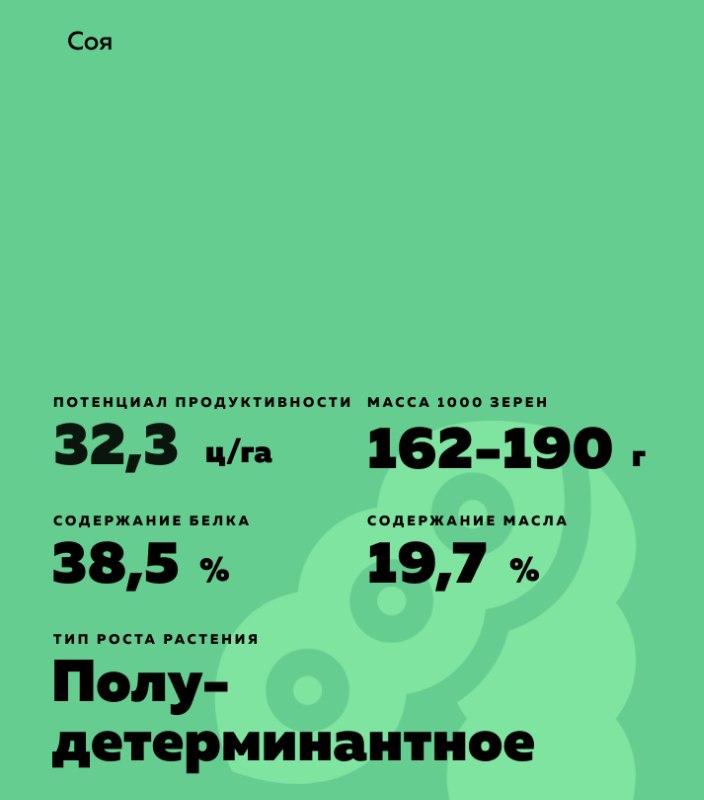 Glycine max (L.) Merr .). Среднеспелый, полудетерминантный. Предназначен для пищевого и зернового использования. Сорт пластичный со слабой реакцией на засуху и переувлажнение.