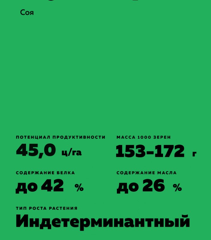 Glycine max (L.) Merr .). Раннеспелый, индетерминантный. Обладает высокой устойчивостью к полеганию.