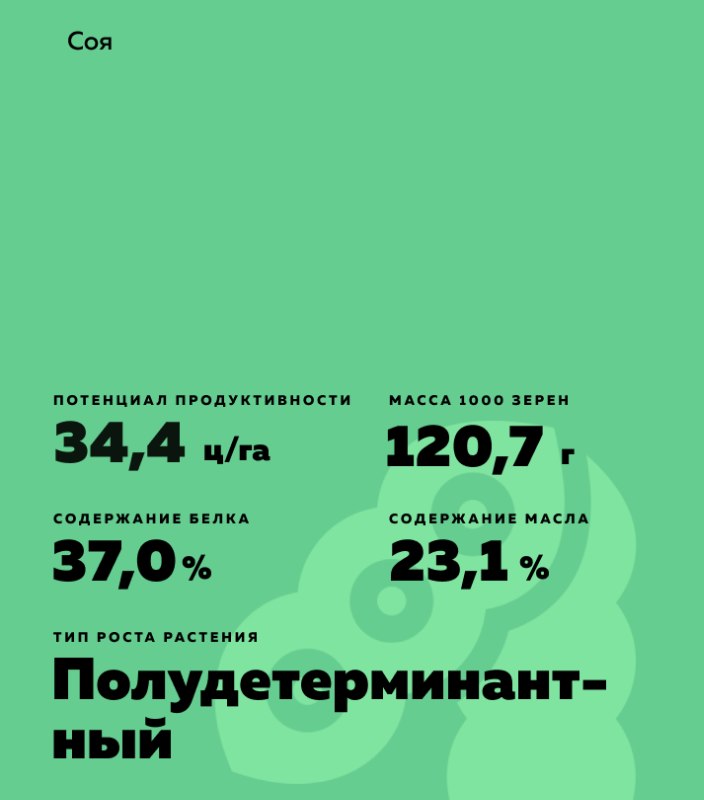 Glycine max (L.) Merr.). Ультраскороспелый сорт, устойчивый к полеганию и осыпанию.