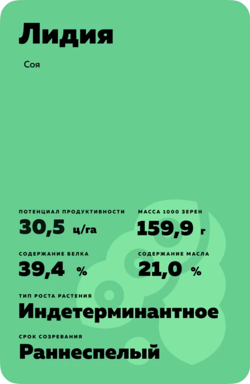 Glycine max (L.) Merr.). Раннеспелый. Устойчив к полеганию и осыпанию.