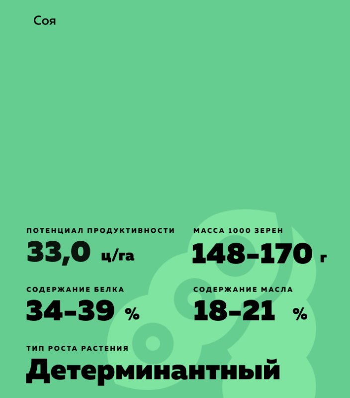 - Средняя урожайность семян в Восточно-Сибирском (11) регионе 21,3 ц/га. Вегетационный период 99 дней. Масса 1000 семян 170,0 г. Содержание белка в семенах 39,6 %, жира 18,0 %. Наибольшая урожайность семян (33,0 ц/га) получена на Уярском ГСУ Красноярского края в 2020 г.