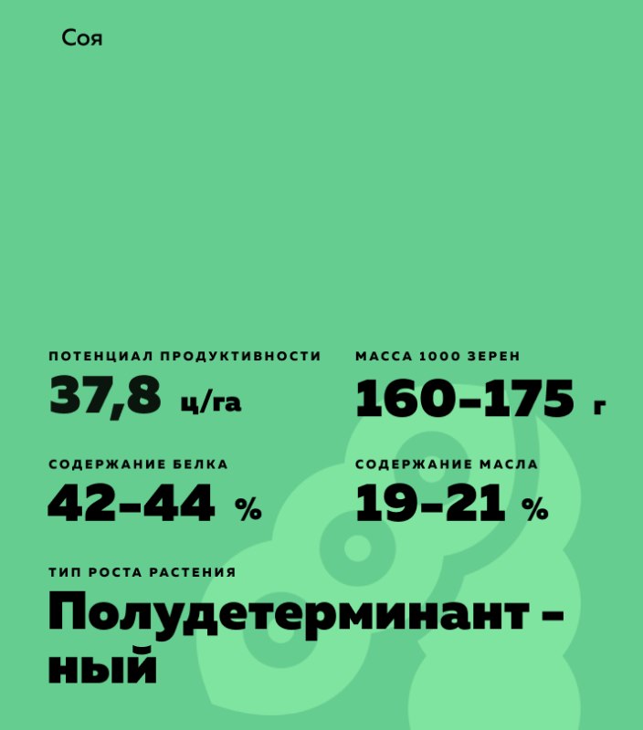 Glycine max (L.) Merr .). Ультраскороспелый, надежно вызревает во всех регионах допуска без десикации. Накапливает в семенах повышенное содержание белка - более 40 процентов.
