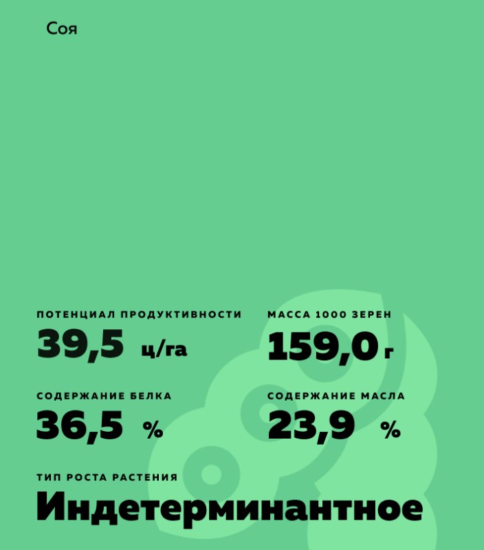 - Средняя урожайность семян в Северо-Кавказском (6) регионе 20,1 ц/га. Вегетационный период - 116 дней. Масса 1000 семян - 159,0 г. Содержание белка в семенах 36,5 %, жира - 23,9 %. Наибольшая урожайность семян (39,5 ц/га) получена на Отрадненском ГСУ Краснодарского края в 2022 г.