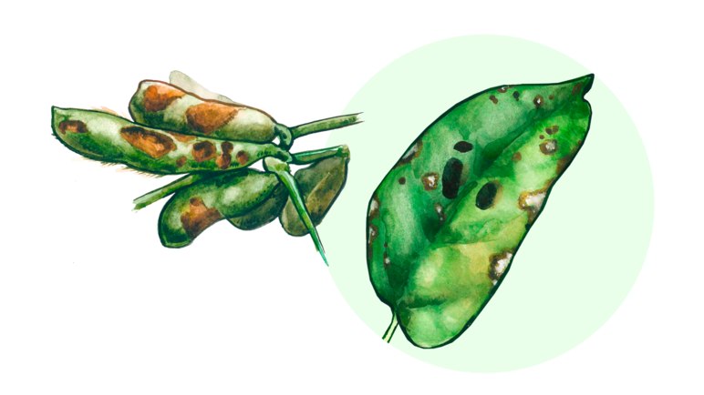 🔶 На бобах пятна вначале мелкие, окаймленные бурым ободком, затем углубляются, увеличиваются в размерах и сливаются. Створки бобов разрушаются, и заболевание распространяется на семена.