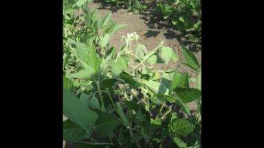 2️⃣ На более поздних этапах роста и развития сои (цветения - формирование бобов) болезнь проявляется в виде желто-коричневых хлоротичных участков вокруг жилок листа, которые начинаются с маленьких, округлых пятен. Пораженные листья скручиваются и засыхают. Стебель приобретает бурую окраску, часто загнивает. Пораженное растение отстает в росте, в итоге увядает и отмирает полностью. Во влажную погоду на пораженных стеблях могут появляться розоватые подушечки. Если на пораженных растениях успевают сформироваться бобы, то их створки обесцвечиваются, формирующееся зерно щуплое с морщинистыми оболочками. Во влажную погоду на бобах и зернах, так же может формироваться розовый налет.