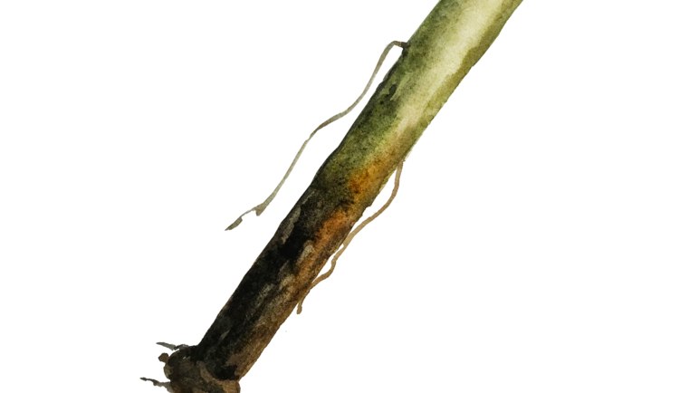 Первые заметные признаки болезни проявляются в начале цветения в виде прикорневых потемнений стеблей подсолнечника. В дальнейшем она вызывает полное увядание растений. На пораженных стеблях появляется светло-серая окраска. При сильном развитии болезни их поверхностная ткань мацерируется в виде удлиненных тяжей. Внутри пораженной ткани стеблей, особенно в центральном цилиндре, в массе образуются черные мелкие склероции .