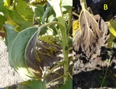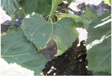 🔷 Первые признаки болезни появляются на нижних листьях подсолнечника в фазу 4-12настоящих листьев в виде темно-бурых некрозов треугольной или неправильной формы.