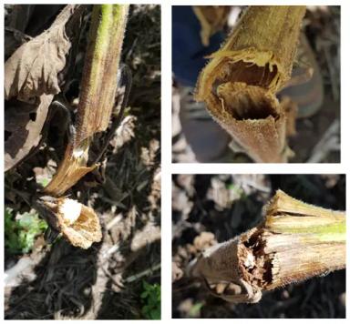 🔷 В дальнейшем болезнь проявляется на стеблях и корзинках с семенами. На стеблях и корзинках растений восприимчивых сортов образуются ярко-бурые некрозы, на устойчивом - ограниченные темные некрозы.