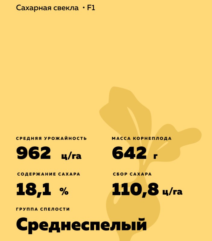 Beta vulgaris L. ssp. vulgaris var. saccharifera Alef.). Односемянный диплоидный гибрид на стерильной основе N-тип. Тип растения: урожайно-сахаристый-среднеспелый. Засухоустойчивость высокая.