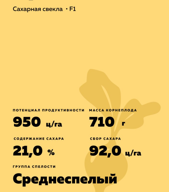 Beta vulgaris L. ssp. vulgaris var. saccharifera Alef.). Односемянный диплоидный гибрид на стерильной основе. Технологичная форма корнеплода.