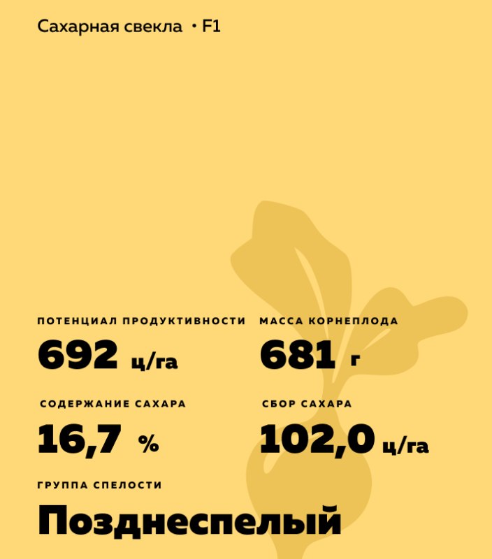 Beta vulgaris L. ssp. vulgaris var. saccharifera Alef.). Одноростковый диплоидный гибрид на стерильной основе Z типа. Тип растения: сахаристый-позднеспелый.