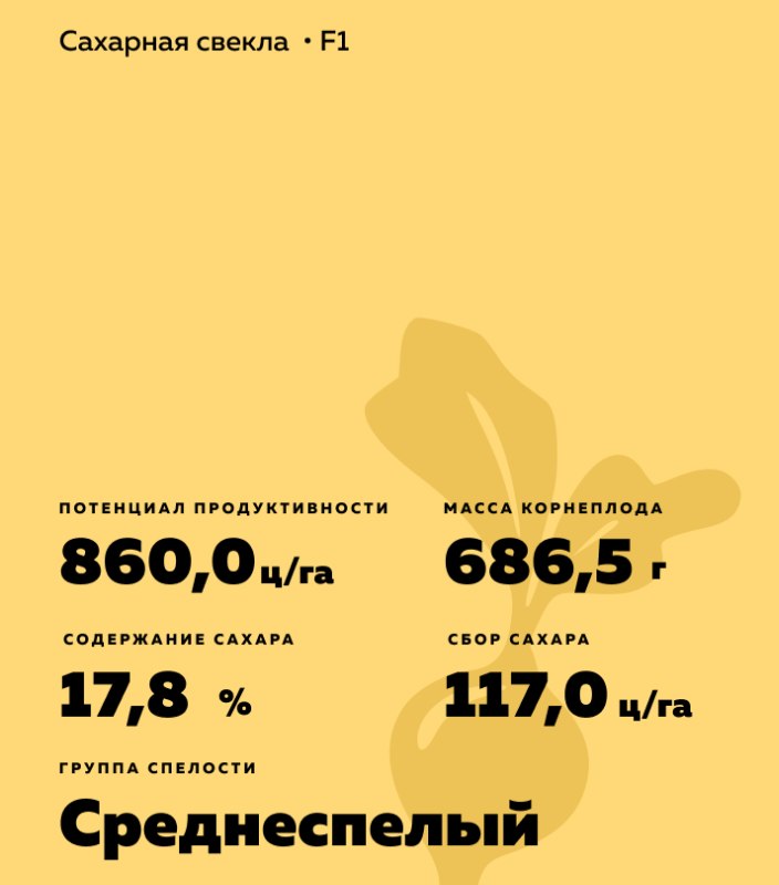 Beta vulgaris L. ssp. vulgaris var. saccharifera Alef.). Одноростковый диплоидный гибрид на стерильной основе N-тип. Тип растения: урожайно-сахаристый-среднеспелый.