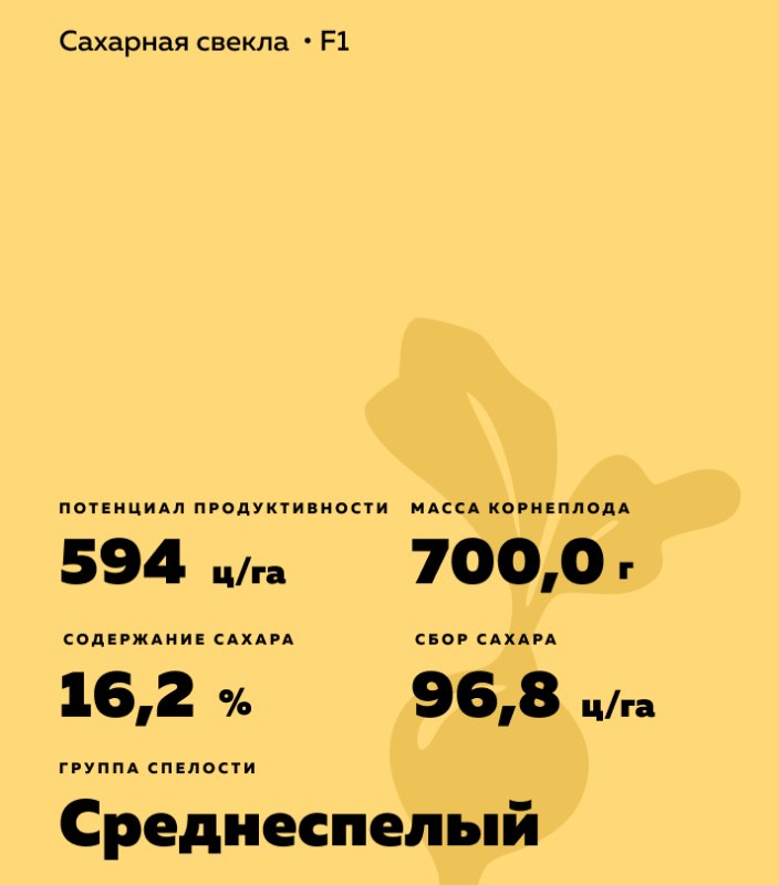 - Оптимален для ранних и средних сроков уборки за счет раннего накопления сахара. Рекомендован для ранних и средних сроков уборки.