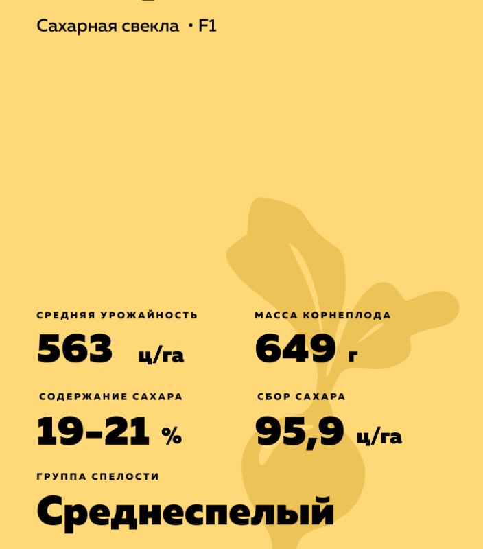 Beta vulgaris L. ssp. vulgaris var. saccharifera Alef.). Тип растения: урожайно-сахаристый-среднеспелый. Односемянный диплоидный гибрид на стерильной основе N типа.