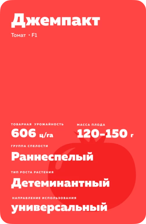 Джемпакт - гибрид томата (Solanum lycopersicum L. var. lycopersicum). Раннеспелый. Для выращивания в открытом грунте и пленочных теплицах. Направление использования: Салатный, свежее потребление и переработка, хорошо подходит для цельноплодного консервирования.