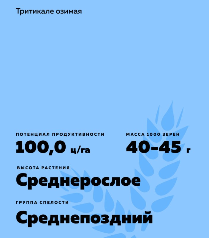 X Triticosecale Wittm. ex A. Camus). Гексаплоидная тритикале «двуручка». Относится к группе зернокормовых сортов, пригоден для использования на зернофураж и в зеленом конвейере, приготовления раннего силоса, сенажа, гранул, брикетов.