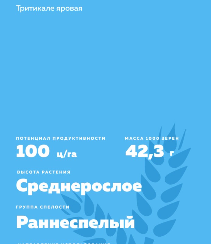 X Triticosecale Wittm. ex A. Camus). Цель использования: предназначен для получения фуражного и продовольственного зерна для производства кондитерских и хлебобулочных изделий.