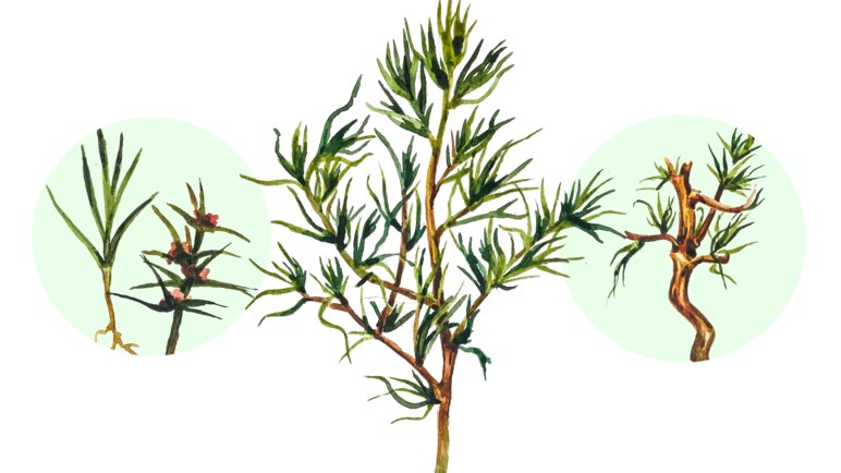 🔷 Листья очередные, полуцилиндрические, колючие, сидячие.