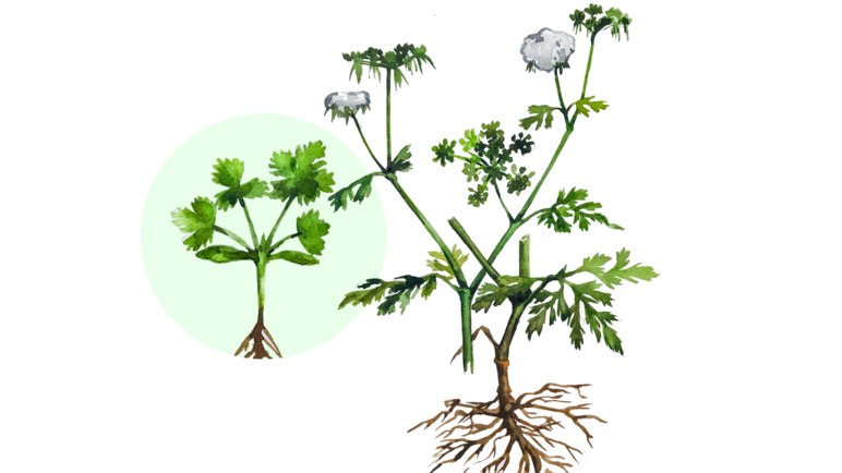 - Ядовитый сорняк. Характерным является наличие едва слышного неприятного запаха. Листьями сорняк напоминает петрушку.