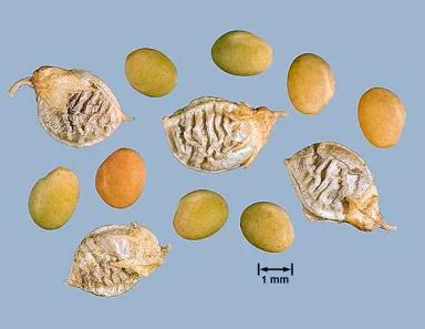 - Семена овально-удлиненные, желтовато-зеленого или светло-коричневого цвета. Размер: 1,75-2,25 х 1,25-1,75 х 1-1,25 мм. Масса 1000 семян 1,75-2,0 г.