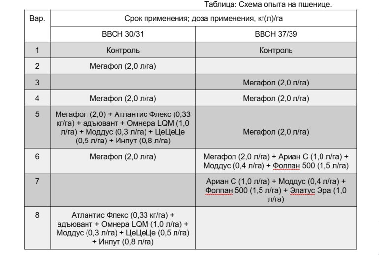 В вариантах 6 и 7 - аналогично вариантам 5 и 8 - химический стресс был вызван применением средств защиты растений. Однако в более поздние сроки (BBCH 37/39). В этом случае вариант 6 получил дополнительные две обработки Мегафолом, а вариант 7 - нет.