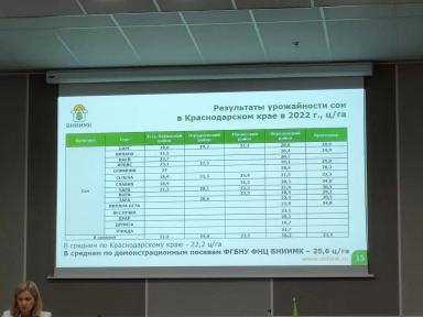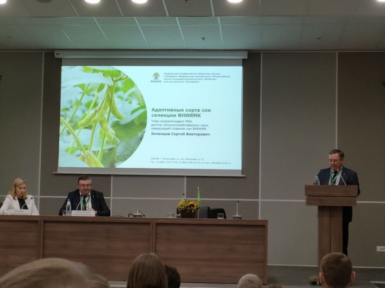 С докладом "Адаптивные сорта сои селекции ВНИИМК" выступил Зеленцов Сергей Викторович, член корреспондент РАН, доктор сельскохозяйственных наук, заведующий отделом сои ВНИИМК.