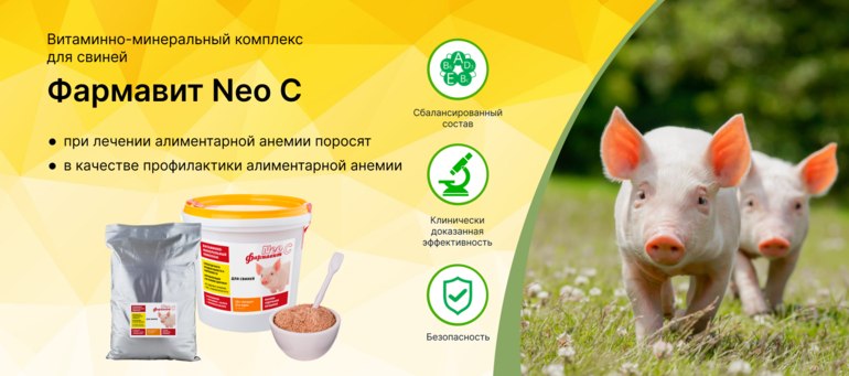 Среди железосодержащих средств для свиноматок и поросят выделяется . Кормовая добавка обладает клинически доказанной эффективностью как при профилактике, так и при лечении алиментарной анемии поросят. Кроме того, витаминно-минеральный комплекс: