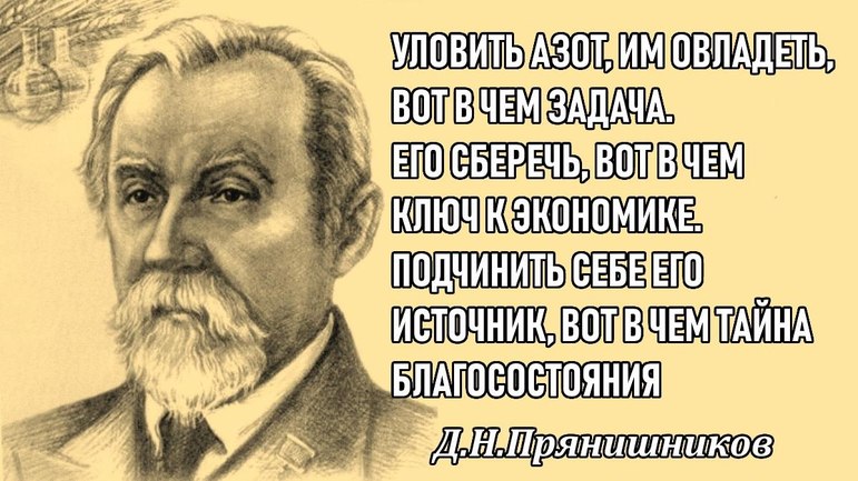 Заканчивая рассказ об азоте, уместно привести замечательные слова из книги Дмитрия Николаевича Прянишникова: "Не считая воды, именно азот является самым могущественным двигателем в процессах развития и творчества природы. Его уловить, им овладеть, вот в чем задача, его сберечь вот в чем ключ к экономике, подчинить себе его источник, вот в чем тайна благосостояния"