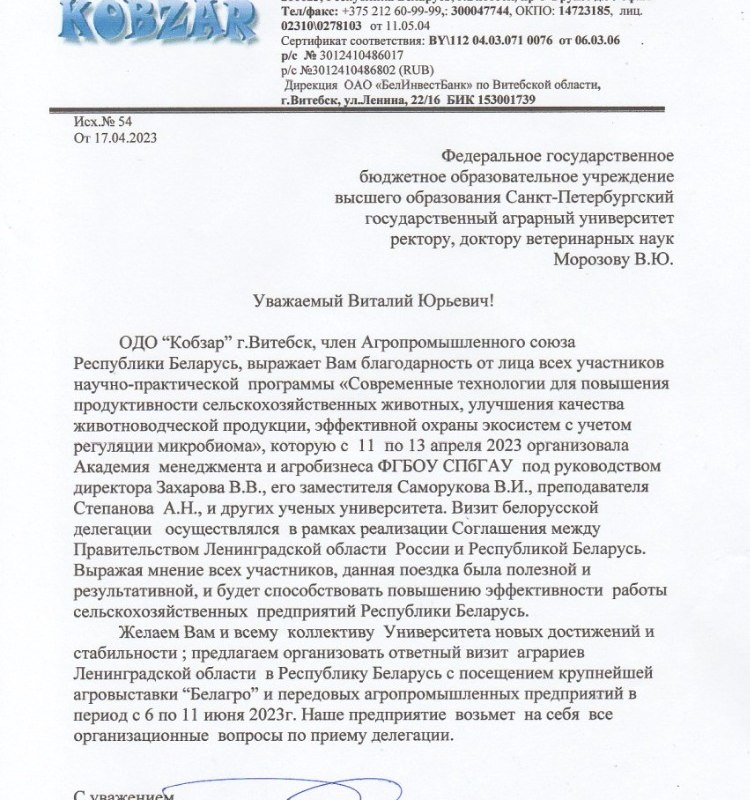 Благодарственное письмо ОДО "Кобзар" г. Витебск