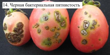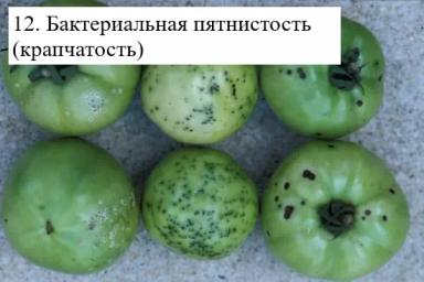 Возбудитель – Pseudomonas syringae (Okabe) Alstatt. Впервые заболевание описано J.C. Walker в Нью-Йорке в 1922 г. и с тех пор распространилось по всему миру. Возбудитель обычно заносится через зараженные семена или может уже присутствовать в окружающей среде. Заболевание проявляется на зеленых плодах томатов в виде небольших черных впалых пятен с темно-зелеными ореолами. Со временем они превращаются в язвы. На спелых плодах пятна от темно-коричневого до черного цвета диаметром 1- 2 мм. Кроме того, бактериальная пятнистость часто проявляется крупными черными пятнами на старых листьях, стеблях, черешках. Понижаются урожайность и качество плодов, ухудшается жизнеспособность растений, растет восприимчивость к другим заболеваниям. В тяжелых случаях бактериальная пятнистость может привести к дефолиации и даже выпаду растений. Степень потерь зависит от тяжести инфекции, восприимчивости сорта и факторов окружающей среды (температуры и влажности). По оценкам, бактериальная пятнистость приводит к потере 52% урожая томатов.