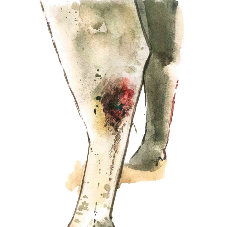- Кальцификация стенок бурсы. Происходит при переходе в хроническую форму бурсита. Наблюдается очень плотная, твердая опухоль. Часто почти безболезненная при прощупывании, но из-за нарушения подвижности тканей животное достаточно сильно хромает.
