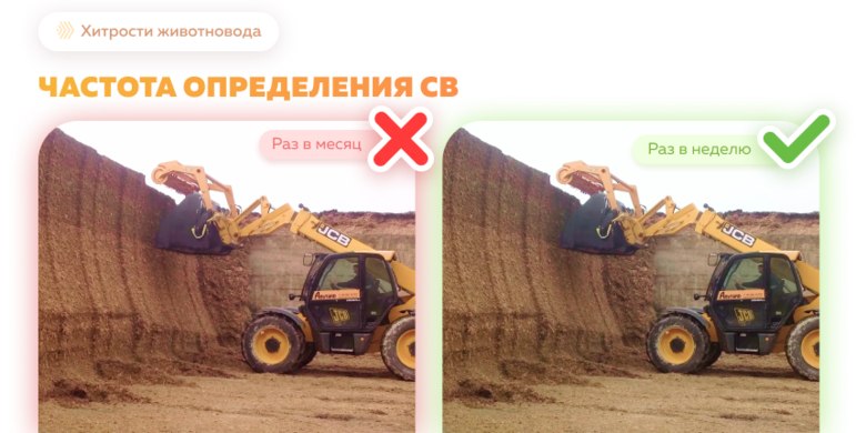 Если, к примеру, из-за осадков происходит изменение влажности силоса, то независимо от графика рекомендуется провести замер СВ. Существенные колебания СВ в основных кормах могут отмечаться в жаркое и холодное время года — при высокой температуре окружающей среды силос способен терять влагу, при более низкой, наоборот, - «брать». Слишком сухие рационы склонны к расслоению, в то время как слишком влажные рационы раскисают в кормосмесителе. Чтобы не упустить структуру рациона и тем самым не навредить животным и не потерять в удоях — в эти периоды измеряйте СВ в основных кормах чаще одного раза в неделю, особенно при перепадах погоды.