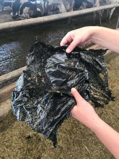 К сожалению, поедание пленки частое явление. Прогноз осторожный, потому что никто не предугадает, как поведет себя пленка в организме животного. Совершенно реально пленка может выйти целиком, кусочками и даже полностью перевариться, т.е. разложиться под действием специфических микроорганизмов, которые находятся в рубце (самая большая камера преджелудков коровы). Да, да, ученные установили, что в рубце у коровы живут бактерии, которые способны разлагать полиэтилен. Такое открытие удалось сделать ученным, которые анализировали корм коровы и установили, что рацион коров уже содержит натуральные растительные полиэфиры. Именно поэтому, исход поедания пленки не всегда плачевный и люди теряют бдительность. На фото из корма я вытащила куски пленки, которой покрывают силосные траншеи или курганы.
