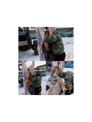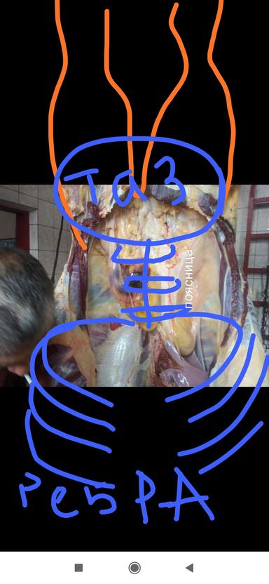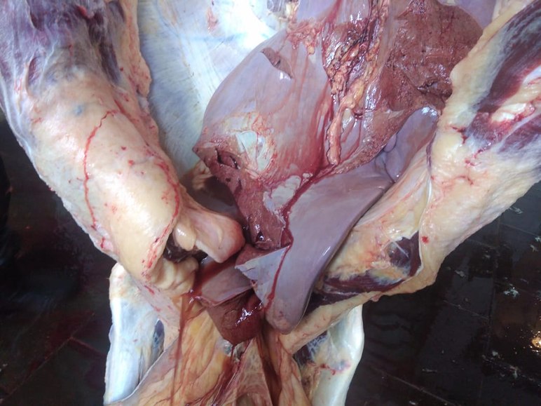 И вот тут стоит обратить внимание на второе фото. Вообще трудно судить, когда вскрытие проводится не по правилам, туша подвешена и в кадре только часть, но судя по топографии вот этот жёлтый шар с кровоизлиянием - это капсула очень увеличенной почки. Ее состояние внутри не известно, так как среза не представлено. Но по капсуле (ограниченное кровоизлияние с вмятиной) кажется, что она тоже снаружи повреждена. Случится это могло в двух случаях - разрыв матки при отеле, либо опять таки прокол инородным телом через кишечник. Жаль, но ни матки, ни кишечника на фото нет. Идёт повреждение изнутри почки (при остром гнойном или даже гнилостным нефрите), либо это переход воспаления с других органов на капсулу - не известно. Потому более тут сказать нечего.