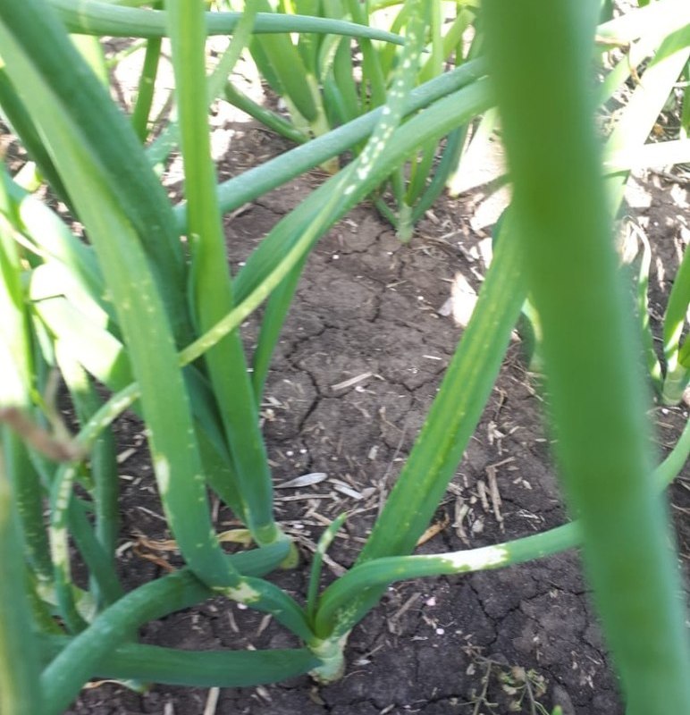 ВОПРОС: Коллеги, добрый день! Что с листьями лука? Неделю назад обработали растения препаратом Ридомил Голд и аминокислотами, сейчас появились вот такие пятна на листьях. Подскажите, чем это могло быть вызвано и как с этим бороться?