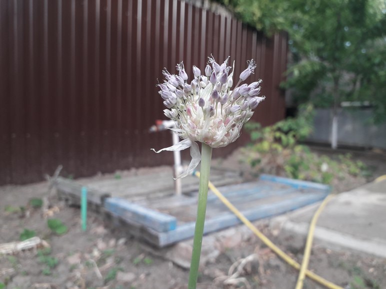 Это декоративный лук. Очень красиво смотрится в цветниках с другими растениями.