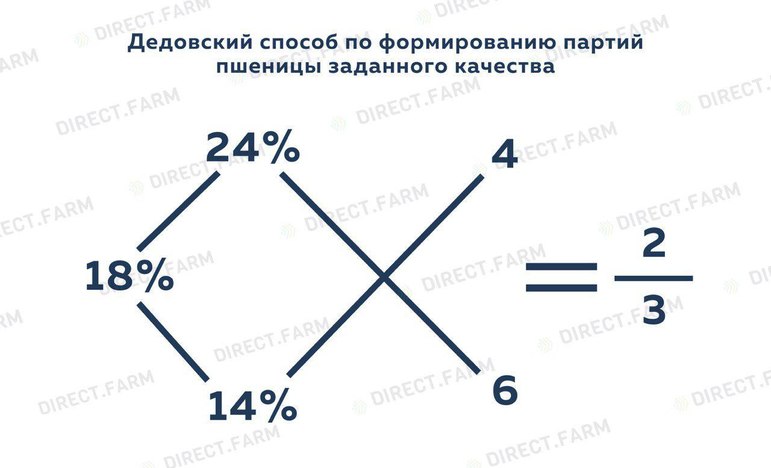 Например: есть пшеница с клейковиной 24% и пшеница с клейковиной 14%, а нам нужно получить клейковину 18%. Действуем следующим способом (ниже прикреплена схема для наглядности):