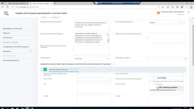 "Сведения об обозначении, идентификации и дополнительная информация" о продукции нажимаем "+". Данные подгружаются сами. Теперь мы набираем Код ТН ВЭД ЕАЭС из декларации>1001990000> Продукты растительного происхождения> Злаки>Пшеница и меслин>Прочие.
