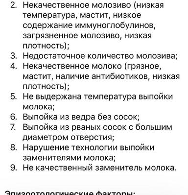 - Некачественное молозиво (низкая температура, мастит, низкое содержание иммуноглобулинов, загрязненное молозиво, низкая плотность);
