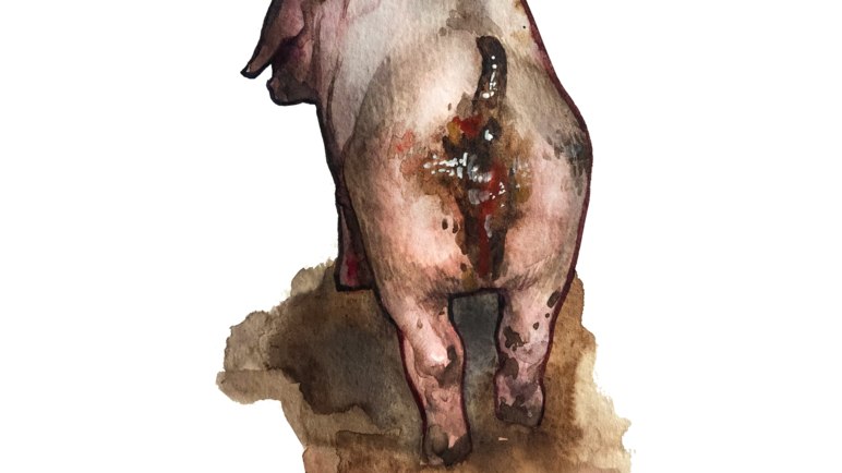 - Острое течение. Температура тела нормальная. Аппетит на начальном этапе болезни нормальный или пониженный. Появление профузной диареи: кал водянистый со слизью, в дальнейшем в нем появляется кровь. Отмечается сильная жажда. Животные истощены, часто встречается рвота. Кожа и уши приобретают синеватый оттенок, холодные на ощупь. Животные вялые, малоподвижные, координация движений нарушена. Падеж свиней – в течение недели после проявления первых симптомов.