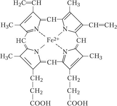 В растениях очень часто железо образует комплексы с так называемыми гемовыми соединениями (смотрите картинку), в данном случае железо находится в форме Fe(2+), именно в таких соединениях железо выполняет многие свои функции