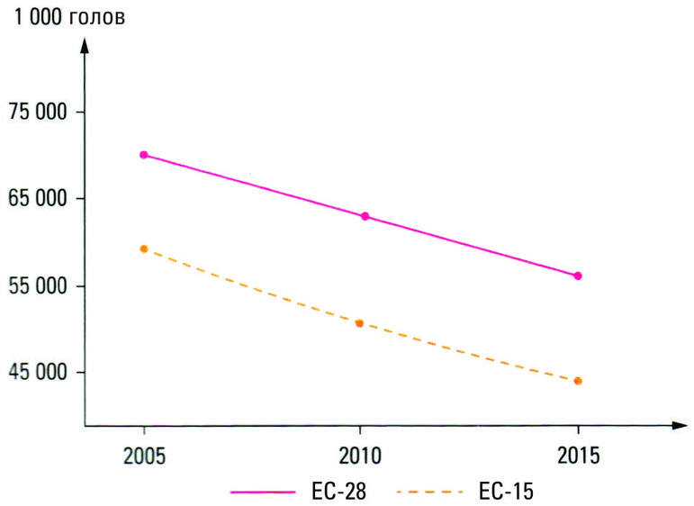 После нескольких лет роста молочное поголовье овец стабилизируется, мясное же продолжает сокращаться (-1,4% по сравнению с 2013 г.) (рис. 1-5 и 1-6).