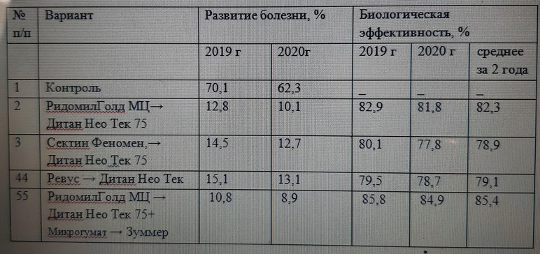 2.РидомилГолд МЦ, ВДГ 2,5 кг/га → Дитан Нео Тек 75, ВДГ 1,4 кг/га.