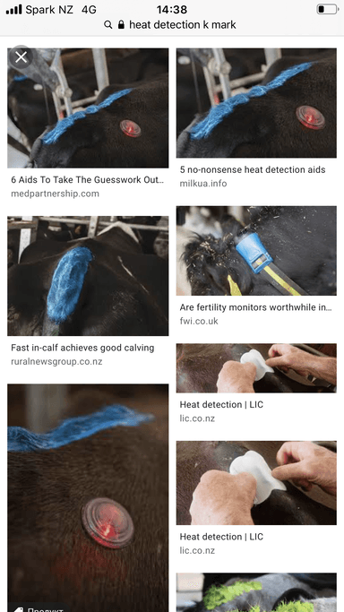 - Применение красок для выявления охоты. Специальные краски, которые наносятся на корень хвоста. При проявлении садки на корову или тёлку, краска стирается, что говорить о том, что на животное необходимо обратить внимание и проверить на наличие охоты. Эффективность до 50%. Не дешево, эффективность работы сильно зависит от культуры персонала. Необходимо обновлять краску у всех, подлежащих осеменению коров, каждый день.