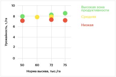 Зона высокой продуктивности. Во всех однородных участках с нормами высева 75 тыс./га мы заметили тенденцию к увеличению урожайности на 2–4 центнера по сравнению с участками, где норма высева была 72 тыс./га. Средний прирост при увеличении нормы высева на 3 тыс. семян по нашим расчётам — 2,5 центнера.