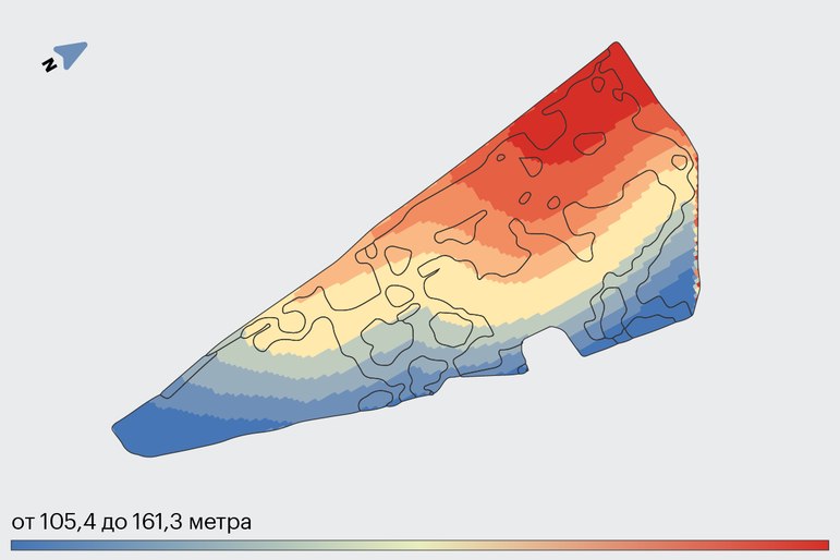 Площадь поля — 112 гектаров. Рельеф неоднородный, перепад высот — 56 метров.