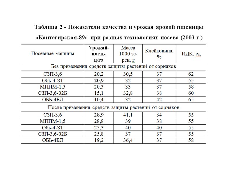 Показатели урожайности были неоднозначными. В условиях дефицитного увлажнения вегетационного периода 2003 года урожайность яровой пшеницы сорта «Кантегирская 89» не превышала 28,9 ц/га. Урожайность зерна по традиционной технологии посева (СЗП-3,6) превосходила все варианты опыта кроме технологии с МППМ-1,5 и Обь-4-ЗТ (табл. 2). Показатели по агрегату ОБЬ-4БЛ были провальными, урожайность без обработки гербицидами была 10,4 ц/га, с применением -19,2ц/га, что на 34% ниже контроля. Урожайность по агрегату СЗП-3,6-02Б была на 12-25% ниже контроля.