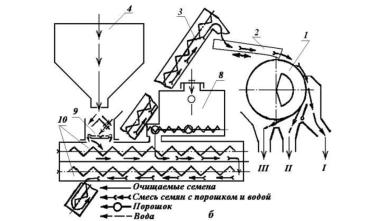 На картинке 3 изображена: Технологическая схема узла очистка магнитной семяочистительной машины К-590А: 1 — загрузочный бункер; 2 — увлажнитель; 3 — смесительное устройство; 4.5— бункера отходов; 6 — приёмник чистых семян; 7 — магнитный барабан: 8 — лотковый транспортёр; 9 — бункер порошка; 10 — наклонный шнек; 11 — порошок; 12 — водяной бачок.